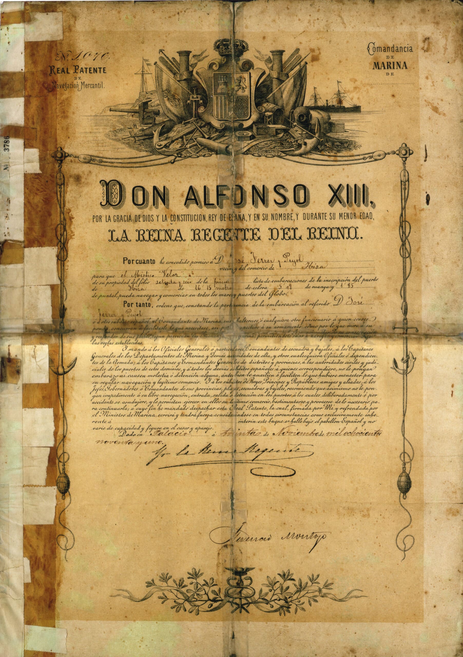 La PATENTE DE NAVEGACIÓN dada en Ibiza en 1891 es el documento más antiguo que conservamos, está firmado por María Cristina, la Reina regente cuando el rey Alfonso XIII era todavía menor de Edad.