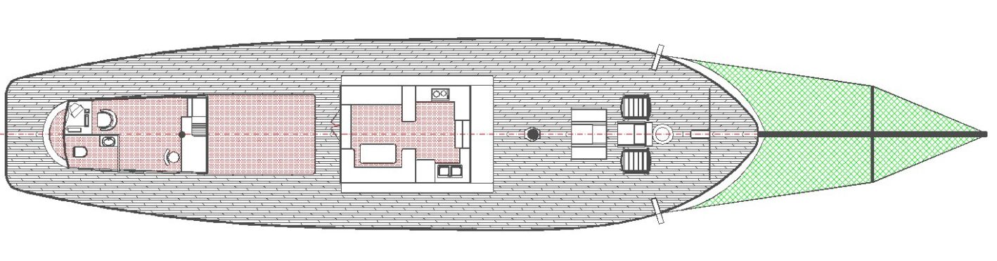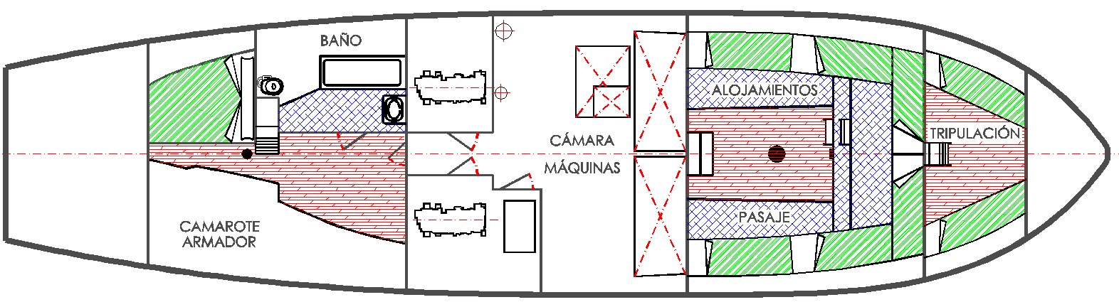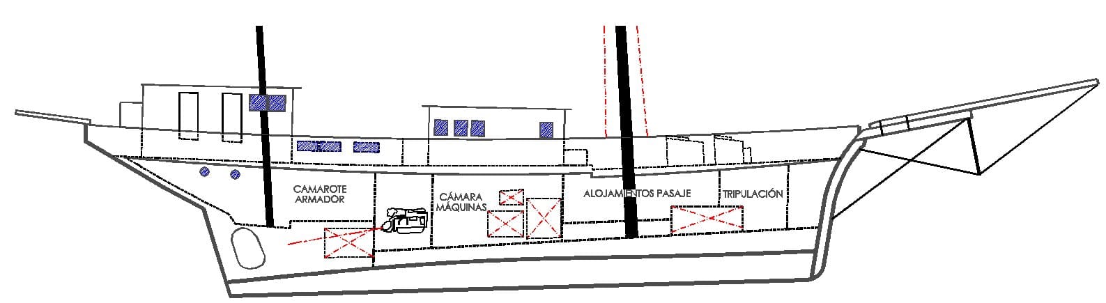 Lo que era antiguamente bodega de carga, se ha modificado para acomodar a un máximo de 10 personas en 4 camarotes. Es un espacio amplio, ventilado y con todo el carácter y la sencillez de un casco de madera hecho para el transporte de carga hace ya más de siglo y medio. La capacidad del barco es de 60 personas en navegaciones de un día y de 10 para semanas completas.