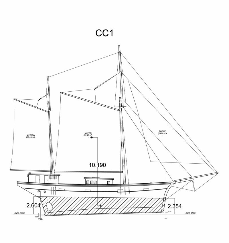 En la popa, un pescante para el bote auxiliar y el caza escotas para reenvío sobre cubierta de la escota de la vela mesana, completan la estampa del barco.