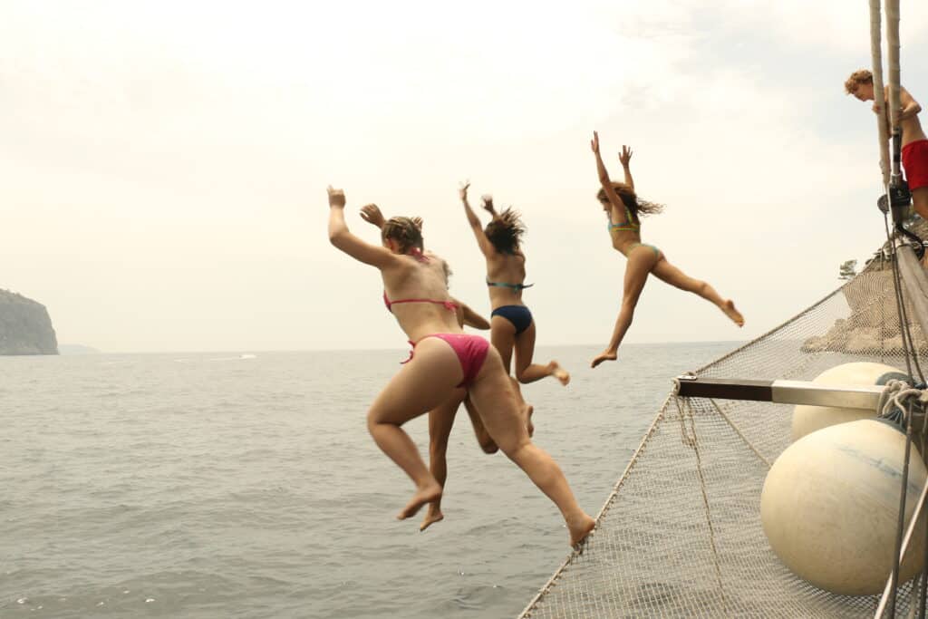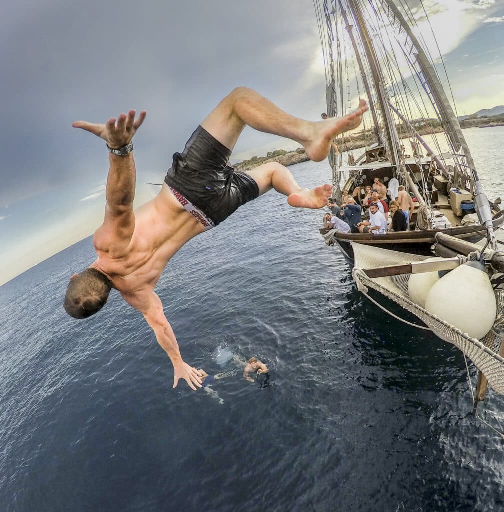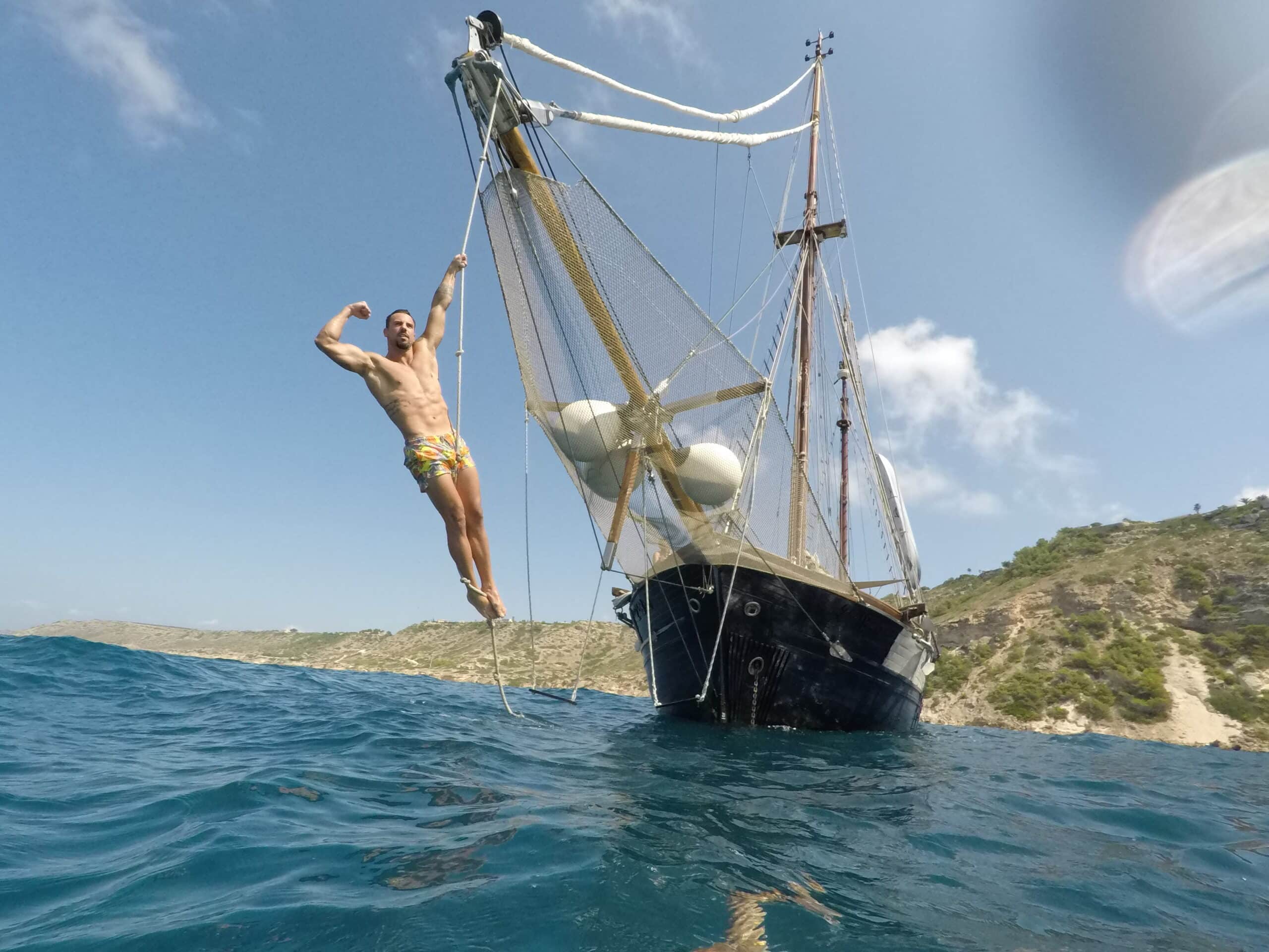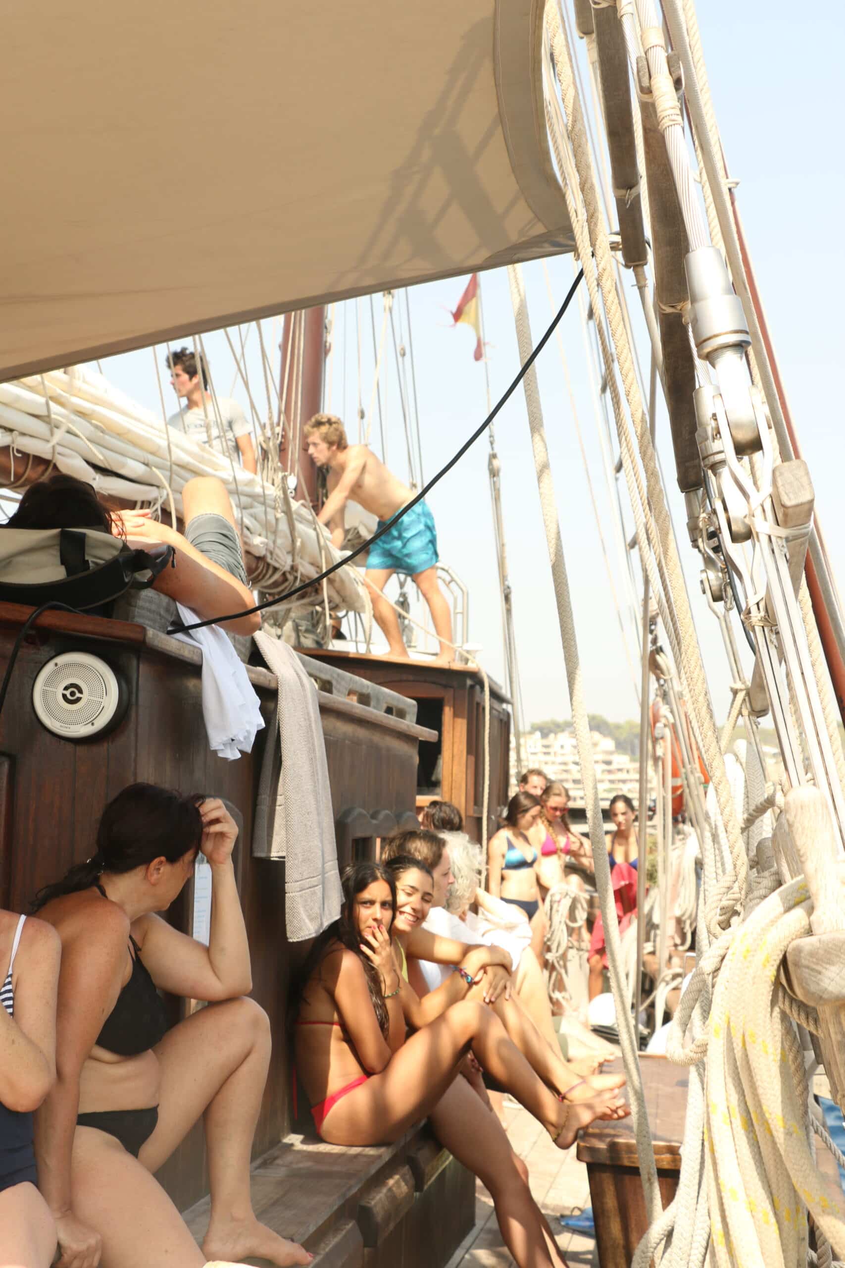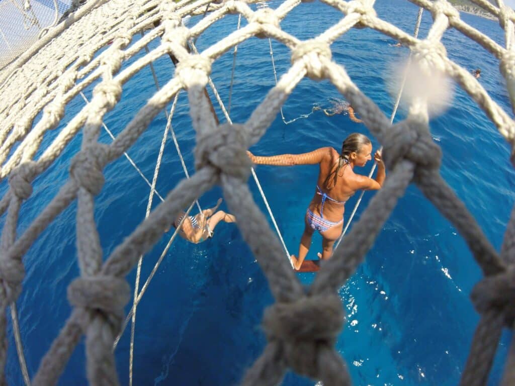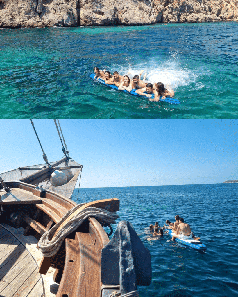 Navegaremos hacia una zona de aguas cristalinas y una vez fondeados, podréis disfrutar de un maravilloso baño, hacer «snorkeling«, descubrir la costa remando en canoa, o utilizando la tabla de paddle surf, y por supuesto, también utilizar los columpios que el barco tiene suspendidos sobre la mar o zambulliros en el agua saltando desde tantas diferentes posibilidades que ofrece el Rafael Verdera.